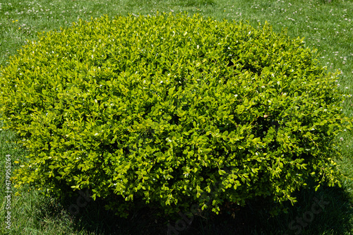 Huge bush of Boxwood Buxus sempervirens or European box with bright shiny young green foliage on blurred green background. Close-up, selective focus. Perfect backdrop for any natural theme.