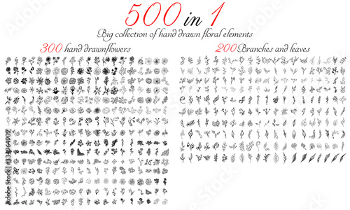 Huge outline collection of 500 hand-drawn floral elements. Big collection of 300 hand-drawn flowers and 200 brunches and leaves. Big floral botanical set isolated on a white background
