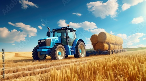 huge tractor collecting haystack in the field in a nice blue sunny day