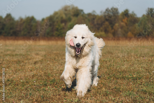 huge white Pyrenean Mountain Dog dashing in field outdoors in sunny day, dogwalking concept