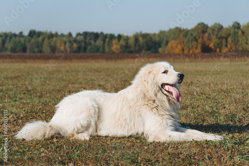 huge white Pyrenean Mountain Dog lying in field outdoors in sunny day, dogwalking concept