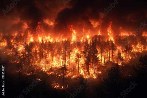 Huge wildfire burning trees in a coniferous forest at night, causing smoke and air pollution