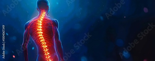 Human Anatomy Illustration with Glowing Spine and Blue Background