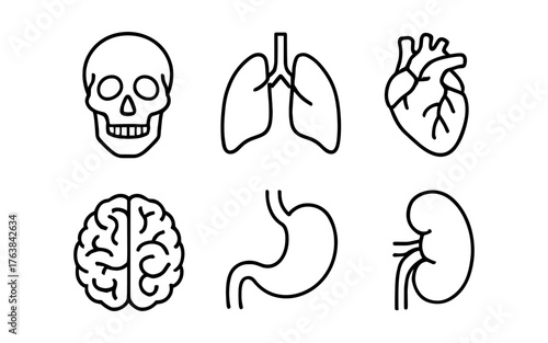 Human anatomy outline art featuring skull, lungs, heart, brain, stomach, and kidney icons