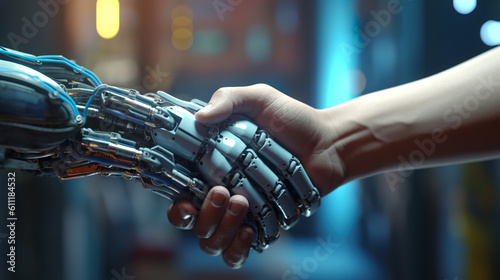 Human and artificial intelligence robot in a handshake to collaborate on future technology. Ai and human partnership. Person shake hand with machine or robot. Generative AI