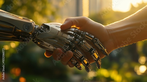 Human and robot shaking hands in agreement