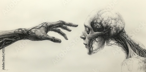 Human and Robotic Hand Connection, Touching Hands, Mechanical and Human Interaction, Future Technology Concept