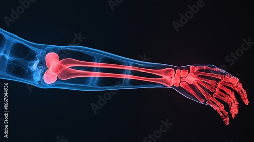 Human arm & hand, skeletal view, showcasing bones, transparent rendering on dark backdrop