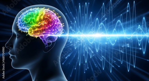 Human brain activity and neural processing. Neuroscience and psychology concept. 3D illustration of brain function with a colorful cerebrum and brainwaves.