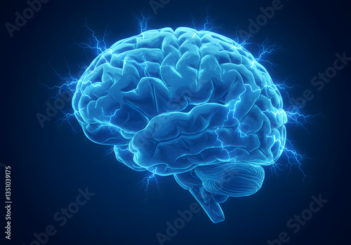 Human brain digital illustration. Electrical activity, flashes and lightning on a blue background. Digital Illustration of the Human Brain. Electrical Activity, Flashes, and Lightning