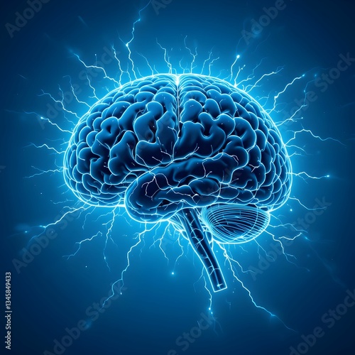 Human brain digital illustration. Electrical activity, flashes and lightning on a blue background. Digital Illustration of the Human Brain. Electrical Activity, Flashes, and Lightning on a Blue