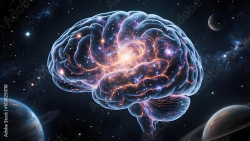 Human brain filled with galaxy patterns floating in outer space, conceptual fusion of cosmic imagery and AI intelligence visualization