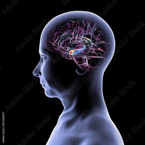 Human brain mid-section with highlighted amygdala (red) and hippocampus (blue), key regions affected in Alzheimer's disease, linked to memory loss and emotional disruption, 3D illustration.