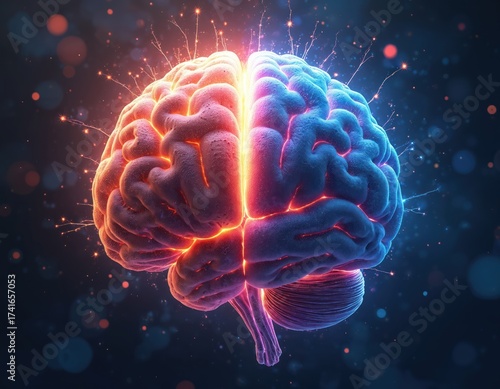 Human brain with glowing neural networks. This digital art represents creativity, neuroscience, artificial intelligence. Light illuminates synapses firing, creating ideas. Blue, red halves contrast.