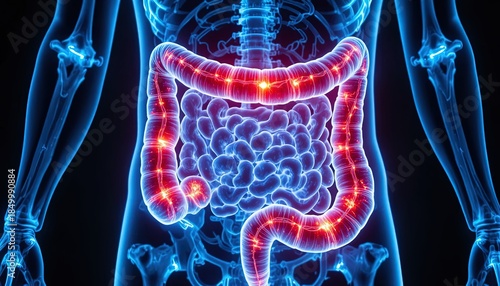 Human digestive system with inflamed intestines and glowing red spots