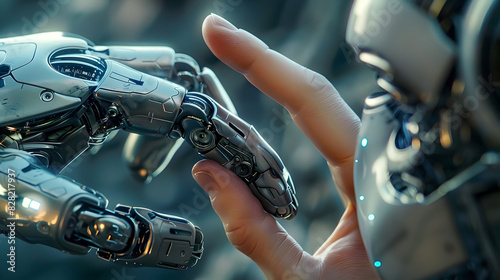 Human Finger Gently Touching Metallic Robotic Hand,Depicting Harmonious Coexistence of Humans and Technology