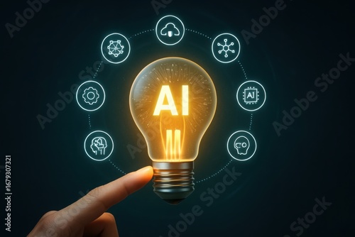 Human finger ignites ai powered lightbulb symbolizing innovation and future technology