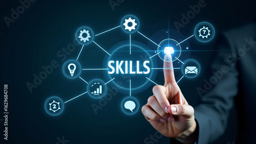 Human finger touching a glowing digital network of skills and icons on a dark background