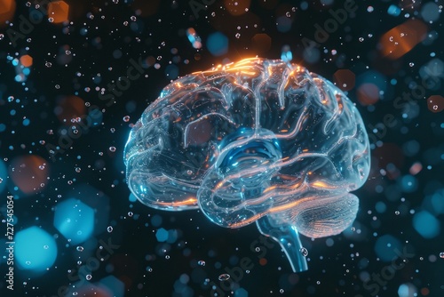 human glassy brain on dark room water drops. 3d rendering. ligh-quality 4K image. Generative AI
