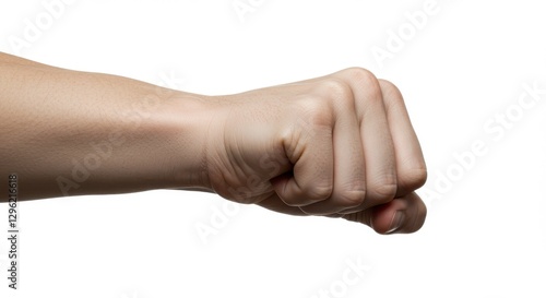 Human hand, clenched fist, knuckles, pale skin, isolated on white background, studio lighting, high detail, close-up, minimalist composition