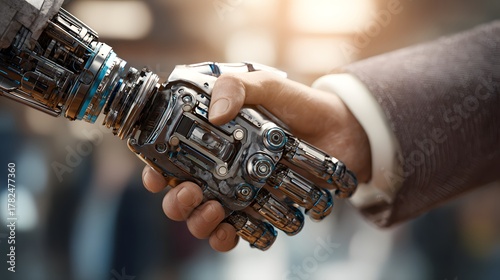 Human hand firmly grasps intricate mechanical appendage in a gesture of partnership
