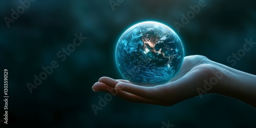 Human hand gently holding a glowing orb representing Earth in a tranquil setting at twilight