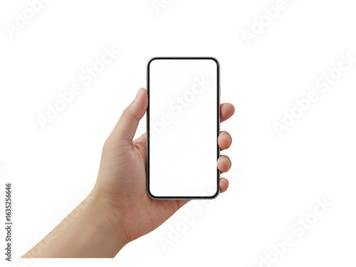 Human hand holding a modern smartphone with a blank gray screen isolated on transparent background