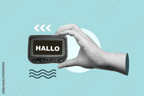 Human hand holding a pager with the text of Hello on the screen. Collage art of Pager