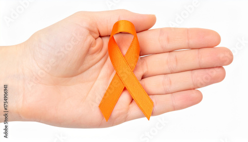 Human hand holding orange awareness ribbon, symbol of leukemia, multiple sclerosis, gun violence
