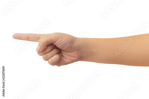 Human hand in forefinger pointer, touch, strike slightly or command gesture isolate on white background with clipping path