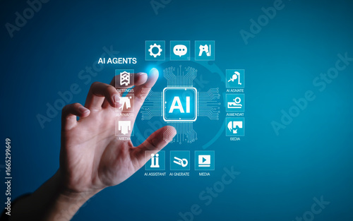 Human hand interacts with futuristic AI agents interface, exploring digital innovation and smart technology