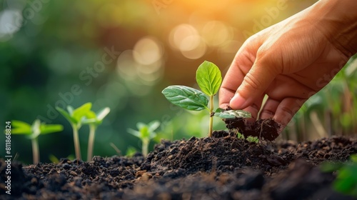 Human hand planting seedlings on fertile soil with sunlight background, Ecology concept