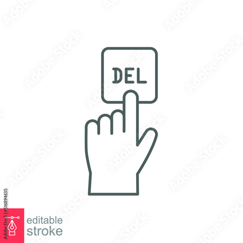 Human hand push the keyboard button delete with the index finger icon. Simple outline style. Getting help, additional information.Isolated vector on white background. Editable stroke EPS 10.