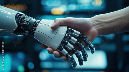 Human Hand Shakes Robotic Arm in High-Tech Environment