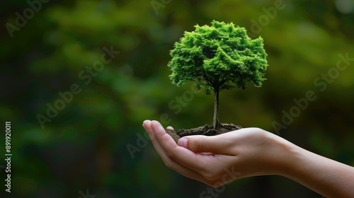 Human hand supporting a green Earth with a tree, capturing the essence of World Environment Day, CO2 reduction, and sustainable practices