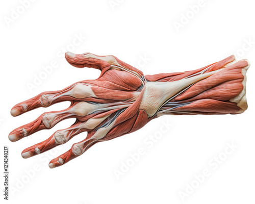 human hand with exposed tendons and muscles, showcasing intricate anatomical details. This highlights complexity of human anatomy and structure of hand