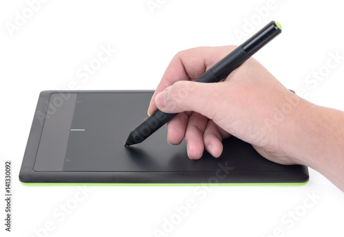 Human hand writing on Digital graphic tablet. Object isolated on white background.