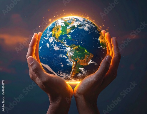 Human hands cradling a glowing Earth, symbolizing care and environmental protection.