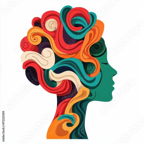 Human head filled with colorful swirling ideas, symbols of business and technology, idea generation, creative thinking