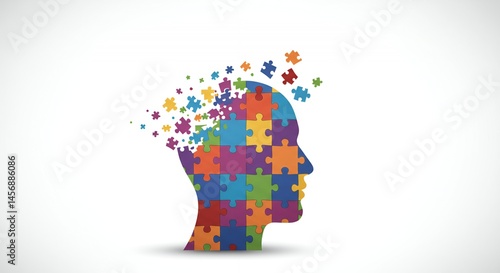Human Head Silhouette Filled with Colorful Puzzle Pieces Dissipating on White Backdrop Conceptual Art