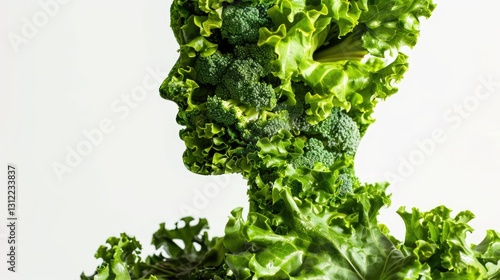 Human head silhouette formed from fresh green leafy vegetables and broccoli on white background