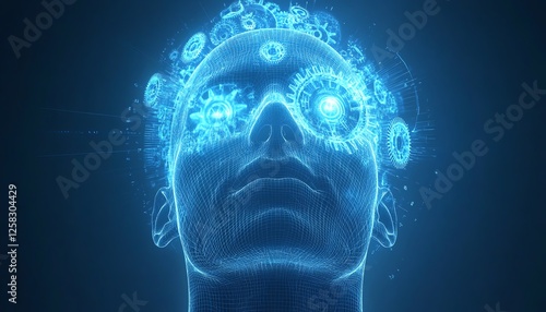 Human head with gears turning inside, blue glowing background, sleek futuristic tech elements, highdetail digital illustration