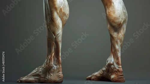 Human Leg Muscles and Veins Anatomy Model. An anatomical visualisation of a human leg with highlighted muscles and veins, showcasing intricate biological details.