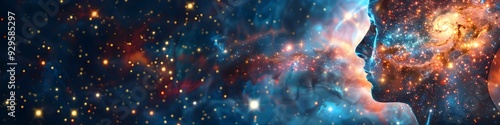 Human mind abstract space science head background. Brain face sky idea universe thought psychology