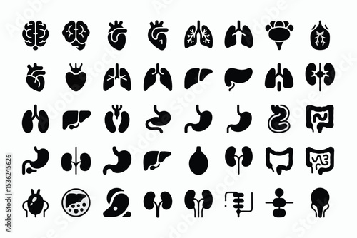 Human organ, anatomy icon set. Vector glyph pictograms of brain, heart, lungs, liver, stomach, intestine, kidney medical, healthcare, and biology concept black silhouette illustration.