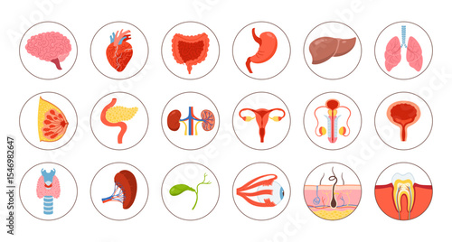 Human organs educational sticker set. Cartoon lung, brain, heart kidneys, liver stomach, reproductive system female male skin hair tooth eye body elements collection. Vector flat illustration icon set