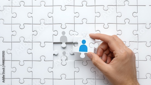 Human Resource: A hand placing a puzzle piece with a human figure, symbolizing the critical role of individuals and talent in organizational structure and growth.