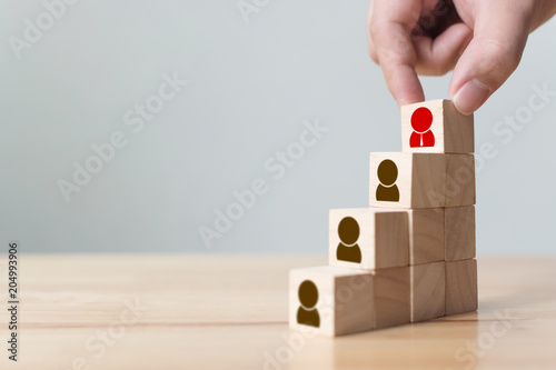 Human resources and talent management and recruitment business concept, Hand putting wood cube block on top staircase, Copy space