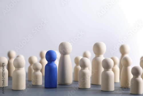 Human resources concept. Blue figure among wooden ones on table against light background, closeup. Space for text