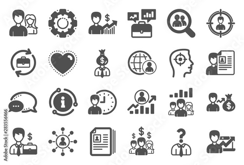 Human Resources, head hunting icons. Business networking contract, Job Interview and Head Hunting contract icons. CV, Teamwork and Portfolio symbols. Business career, human, interview. Vector